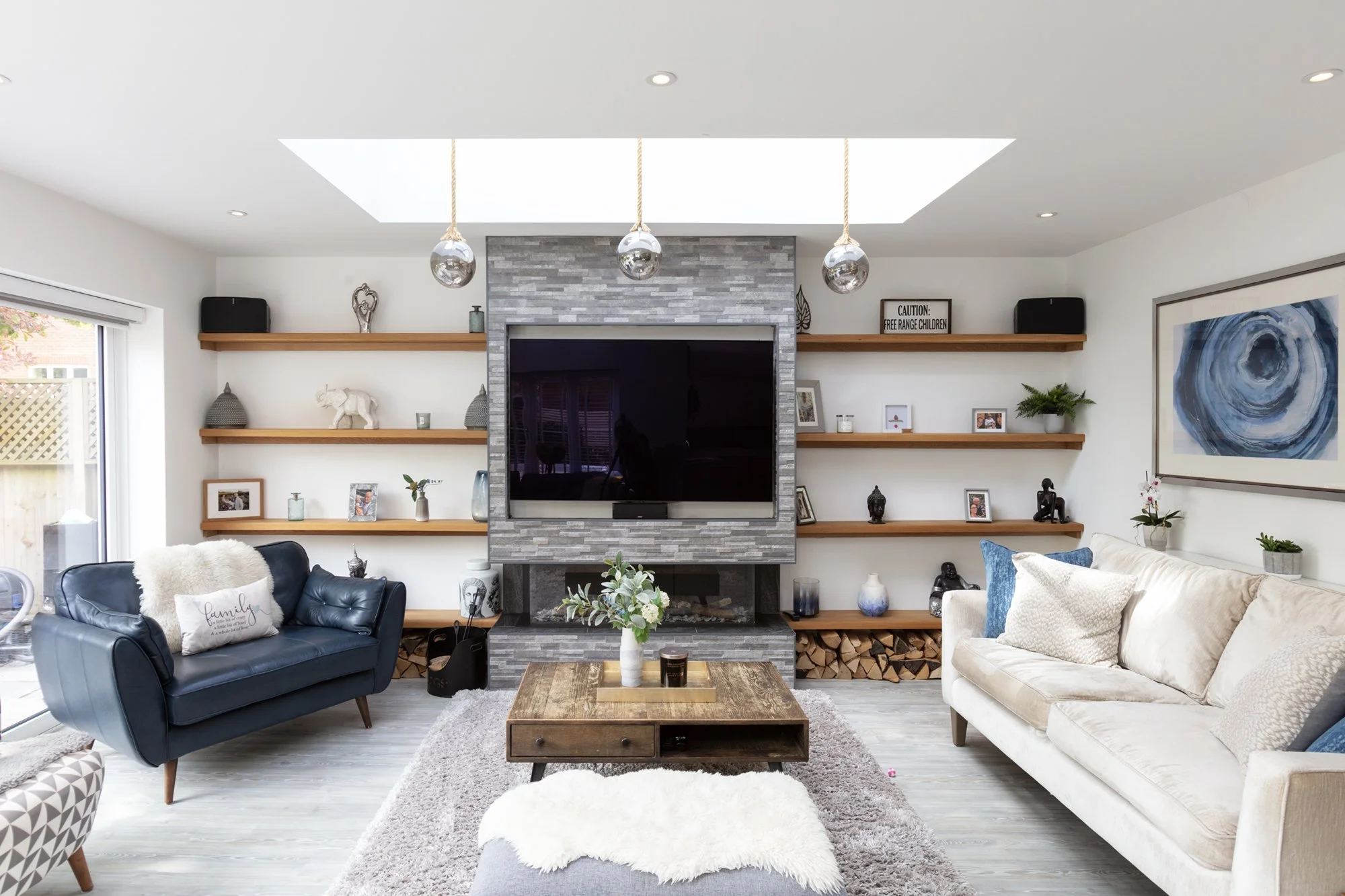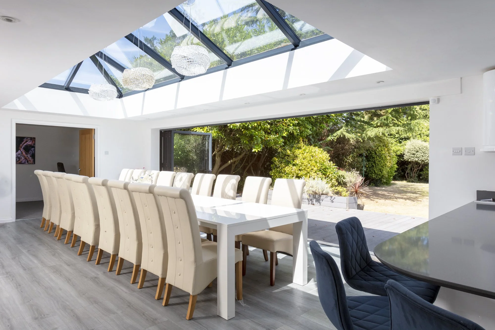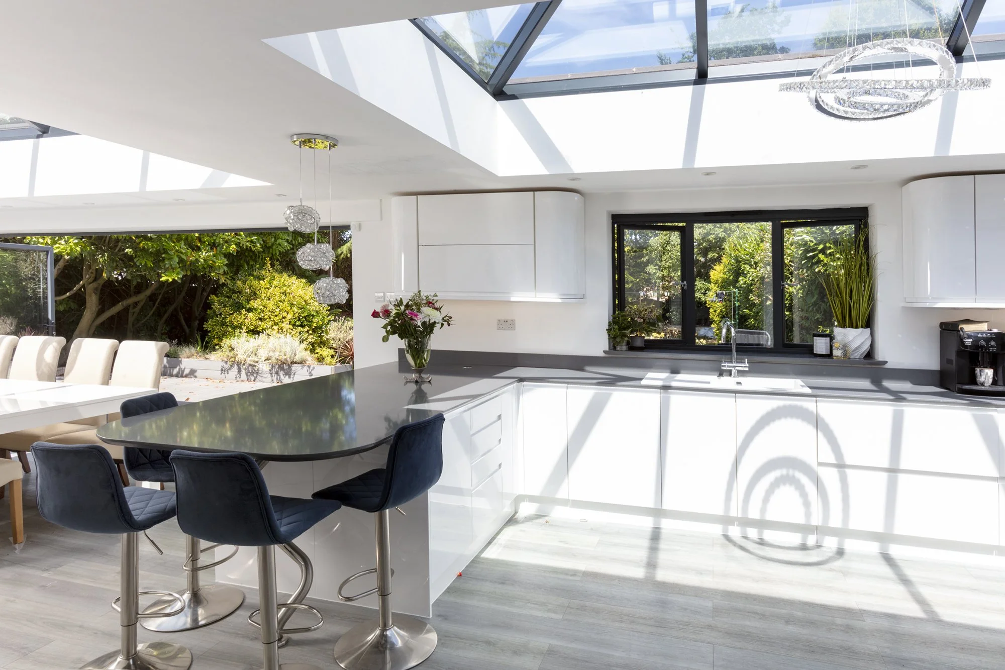 Open-plan extension with large format glazing, rooflights and a fully reworked living space, designed for modern day living.